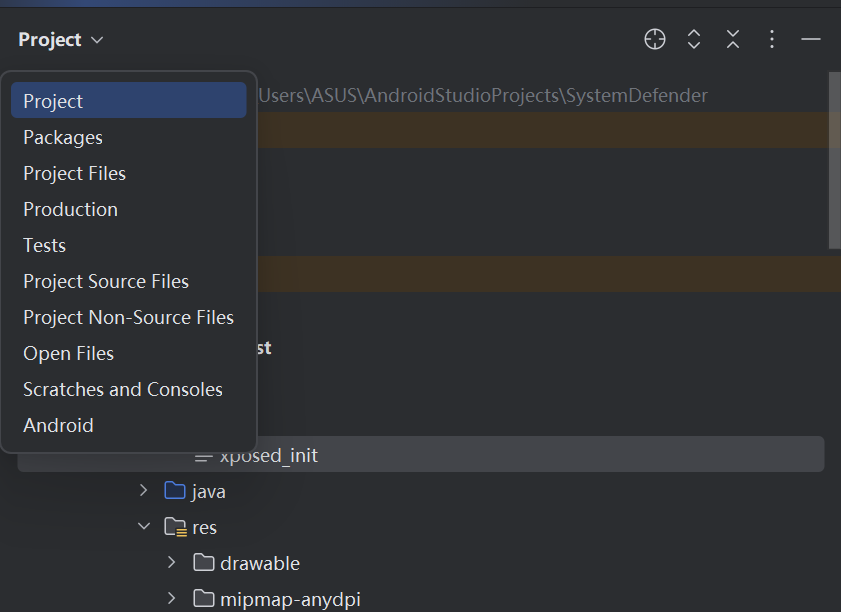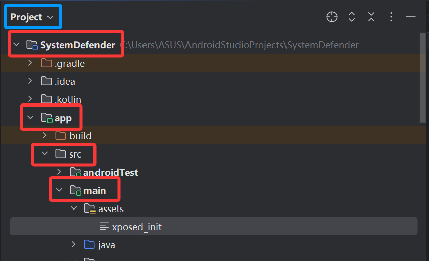 你需要在你的项目名称/app/src/main下创建assets文件夹(右键创建的时候需要注意,需要作为资源(Resource)目录创建,而且不能是其他名字),并在里面新建xposed_init文件(注意:不包含任何扩展名,文件名也必须保持一致)